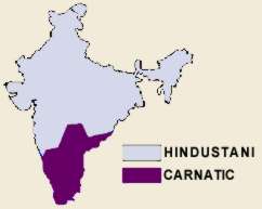 Επειδή και οι δύο αυτές εισβολές, των Ινδοευρωπαίων και των μουσουλμάνων, ήρθαν από βορρά, και εξασθενούσαν πηγαίνοντας νότια, όσο πιό νότια ήταν ένα κράτος, τόσο μικρότερη ήταν η επιρροή της αυλής του Δελχί, κι αυτό ίσως εξηγεί ως ένα βαθμό τη σταδιακή απομάκρυνση της μουσικής του Νότου από τη μουσική του Βορρά, που σήμερα αποκαλείται «Χιντουστάνι».