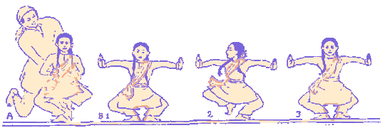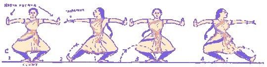 AdavusΤα χορευτικά βήματα είναι οργανωμένα σε 64 βασικές οικογένειες, που λέγονται adavus, η καθεμιά με πολλά διαφορετικά βήματα.NrityaΗ Nritya συνδυάζει τον καθαρό ρυθμικό χορό με την απόδοση των συναισθημάτων του ποιητικού κειμένου μέσω των εκφράσεων του προσώπου, των χεριών κι ολόκληρου του σώματος.Ο ηθοποιός έχει στο οπλοστάσιό του ένα περίπλοκο ρεπερτόριο από στυλιζαρισμένες κινήσεις. Συγκεκριμένου νοήματος κινήσεις υπάρχουν για κάθε μέρος του σώματος, αλλά τα μάτια και τα χέρια είναι τα πιό σημαντικά. Υπάρχουν 13 κινήσεις του κεφαλιού, επτά των φρυδιών, έξι για τη μύτη, έξι για το μάγουλο, επτά για το πηγούνι, εννιά για το λαιμό, πέντε για τα στήθη και 36 για τα μάτια. Υπάρχουν 32 κινήσεις των ποδιών, 16 στο έδαφος και 16 στον αέρα. Διάφορες θέσεις των ποδιών αναλύονται λεπτομερώς. Υπάρχουν 24 κινήσεις του ενός χεριού (asamyuta-hasta) και 13 για τα δύο χέρια μαζί (samyuta-hasta). ( Βλέπε σελίδα Hastas/Mudras)